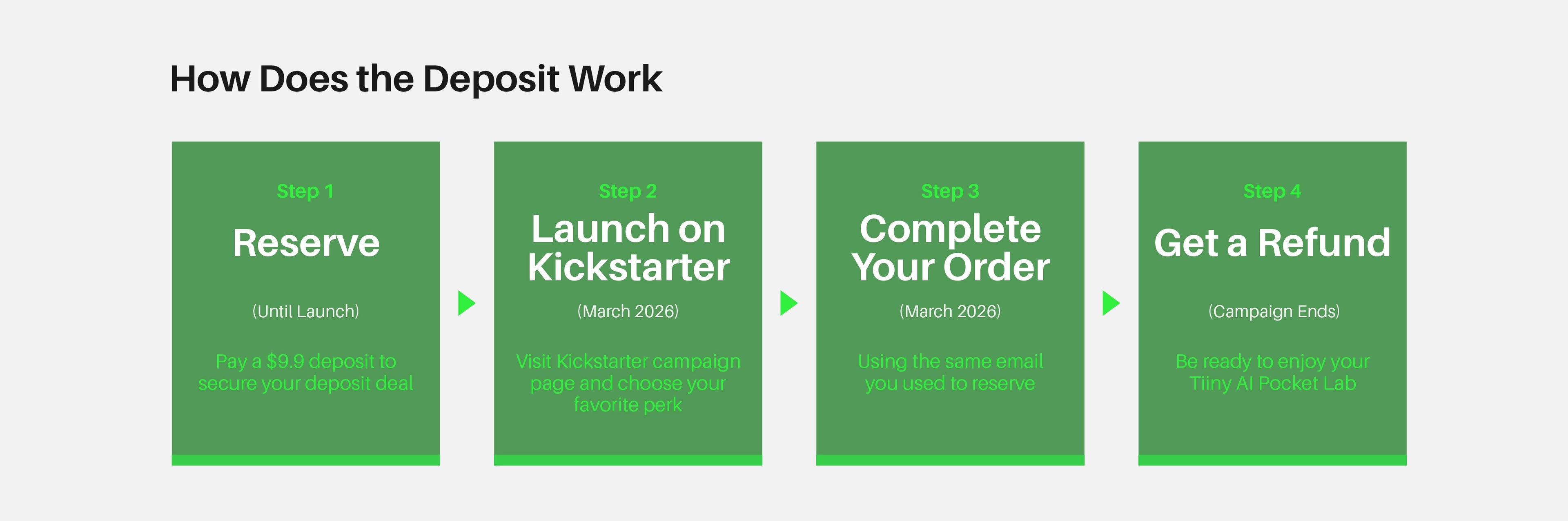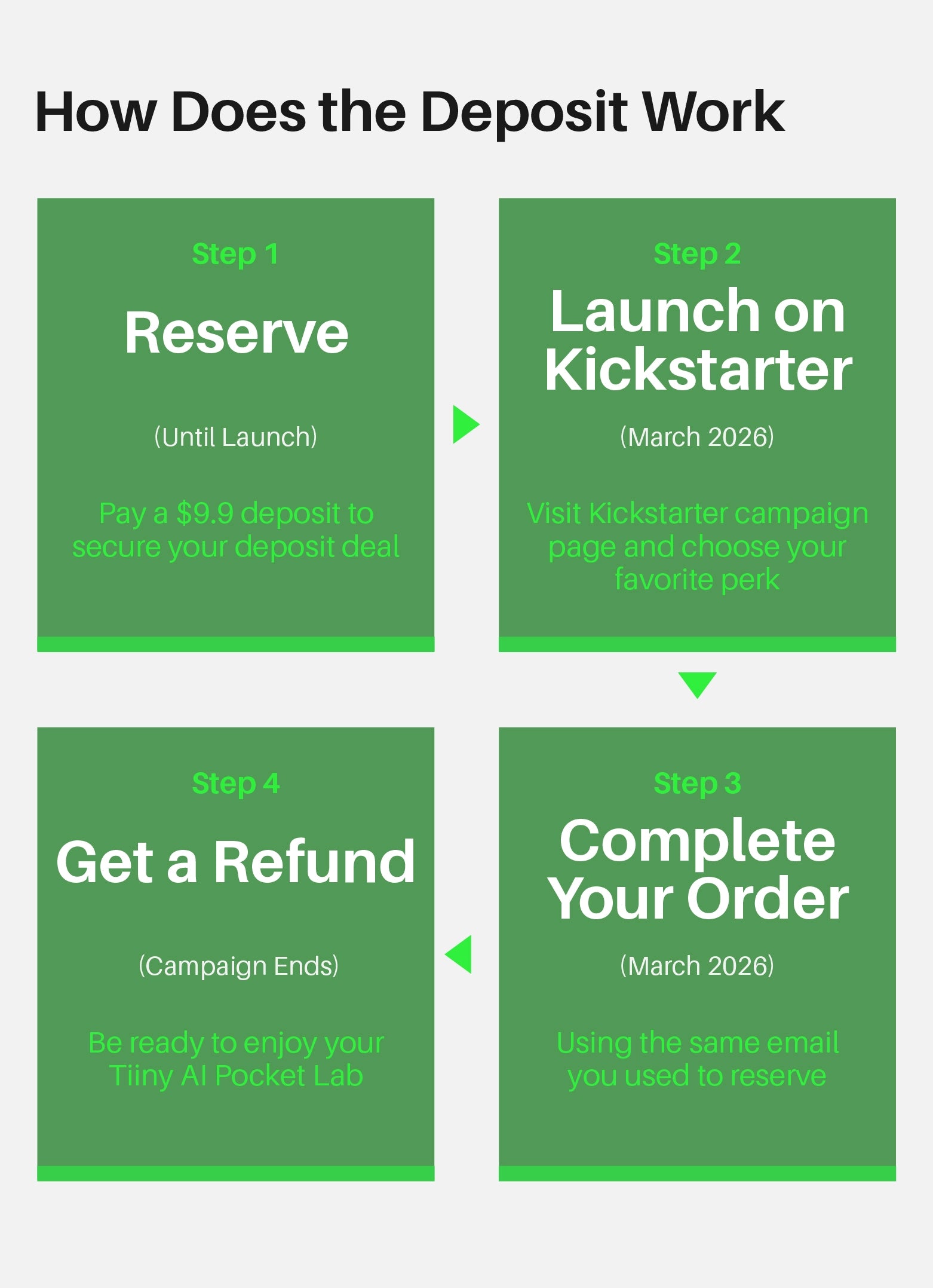 To ensure a smooth refund process, we will match your Kickstarter email address against our pre-order list to verify whether a deposit has been placed. Please make sure that the email address you use to pay the deposit is the same as the email address associated with your Kickstarter account.